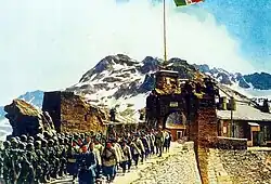 En mars 1945, une partie du détachement d’armée des Alpes commandé par le général Doyen a pour objectif de reprendre le col du Petit-Saint-Bernard, dont les positions du Roc Noir et de la Redoute-Ruinée[13]. Cependant, l’opération s’effectue dans de mauvaises conditions météorologiques et les chasseurs du 13e bataillon de chasseurs alpins ne parviennent pas au col[13]. Les occupants allemands du fort finissent par se rendre le [14],[15].