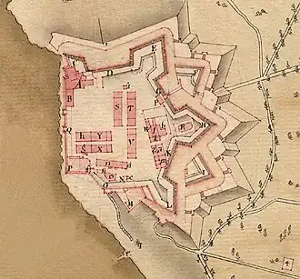 Le plan réalisé en 1679 montre les dispositions des casernes qui n'ont plus été modifiées. Au sud, sont représentés l'église et le magasin à poudre.