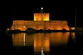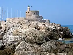 Cette forteresse médiévale circulaire est construite entre 1464 et 1467, au bout de la jetée du vieux port Mandraki de Rhodes[1] (sur le lieu présumé de la construction du colosse de Rhodes[2],[3] du IIIe siècle av. J.-C., une des Sept Merveilles du monde de l'Antiquité). Elle défend le vieux port et le Collachium et ses fortifications de Rhodes des frères hospitaliers de l'ordre de Saint-Jean de Jérusalem[4],[5], héritiers de la flotte de l'ordre du Temple.