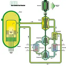 Les concepts de réacteur rapide à caloporteur gaz reposent sur différentes configurations de combustible (crayons, plaques, prismatique), différentes formes physico-chimiques du combustible (notamment à base de céramique) et un caloporteur hélium. La température en sortie de cœur est d'environ 850 °C, la production électrique est réalisée par une turbine à gaz selon un cycle direct Brayton qui assure une bonne efficacité thermique.