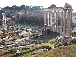 En -509, la royauté est abolie, laissant place à la République. Cet évènement ne semble pas altérer le développement de la ville. La première modification importante de la topographie du forum intervient avec la construction de deux sanctuaires, l'un dédié à Saturne, et l'autre dédié aux Dioscures, culte importé de Grèce. Le temple de Saturne, dont la construction a peut-être commencé sous la Royauté, se dresse à l'emplacement d'un vieil autel déjà dédié à ce dieu[8].