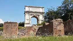 En arrivant à hauteur du haut podium du temple de Saturne, on tourne à gauche pour passer entre les Rostres et la basilique Julia. La voie est délimitée d'un côté par le portique de la basilique et de l'autre par la succession de sept grandes colonnes honorifiques. Arrivé au bout du portique, une rue, le Vicus Tuscus s'ouvre à droite et descend vers le Tibre en passant par le Vélabre. En face, un deuxième arc d'Auguste marque une deuxième entrée sur le forum, entre la tribune qui précède le temple des Dioscures et le temple de César. Après avoir franchi cet arc, on se trouve tout près du sanctuaire de Vesta, au pied du Palatin.