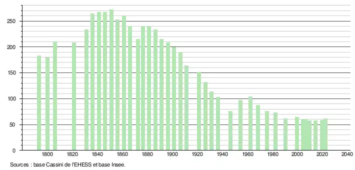 L'évolution du nombre d'habitants est connue à travers les recensements de la population effectués dans la commune depuis 1793. Pour les communes de moins de 10 000 habitants, une enquête de recensement portant sur toute la population est réalisée tous les cinq ans, les populations de référence des années intermédiaires étant quant à elles estimées par interpolation ou extrapolation[17]. Pour la commune, le premier recensement exhaustif entrant dans le cadre du nouveau dispositif a été réalisé en 2004[18].