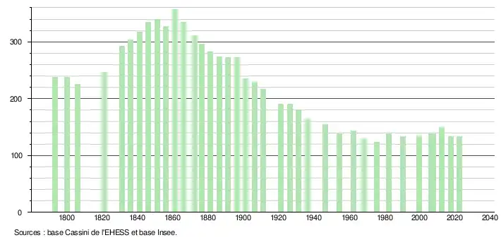 L'évolution du nombre d'habitants est connue à travers les recensements de la population effectués dans la commune depuis 1793. Pour les communes de moins de 10 000 habitants, une enquête de recensement portant sur toute la population est réalisée tous les cinq ans, les populations de référence des années intermédiaires étant quant à elles estimées par interpolation ou extrapolation[16]. Pour la commune, le premier recensement exhaustif entrant dans le cadre du nouveau dispositif a été réalisé en 2007[17].