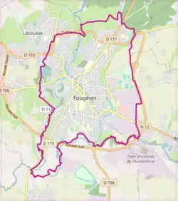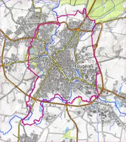 Elle appartient à l'unité urbaine de Fougères[Note 9], une agglomération intra-départementale regroupant quatre communes, dont elle est ville-centre[Note 10],[24],[25]. Par ailleurs la commune fait partie de l'aire d'attraction de Fougères, dont elle est la commune-centre[Note 11],[25]. Cette aire, qui regroupe 26 communes, est catégorisée dans les aires de 50 000 à moins de 200 000 habitants[26],[27].