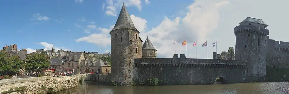 La première fortification est bâtie au XIesiècle par les seigneurs de Fougères dont le premier est MainII de Fougères. Elle est défendue par Raoul II (1130-1194), mais prise, avec la ville, par Henri II Plantagenêt en 1166; le château est rasé[38]. Raoul II, obstiné, la fera reconstruire en plus imposante, et elle deviendra une place forte défendant les frontières de la Bretagne, du mont Saint-Michel à Nantes.
