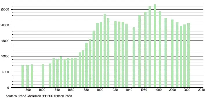 ↑ Par convention dans Wikipédia, le principe a été retenu de n’afficher dans le tableau des recensements et le graphique, pour les populations de référence postérieures à 1999, que les populations correspondant à une enquête exhaustive de recensement pour les communes de moins de 10000habitants, et que les populations des années 2006, 2011, 2016, etc. pour les communes de plus de 10000habitants, ainsi que la dernière population de référence publiée par l’Insee pour l'ensemble des communes.