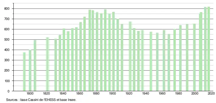 L'évolution du nombre d'habitants est connue à travers les recensements de la population effectués dans la commune depuis 1793. Pour les communes de moins de 10 000 habitants, une enquête de recensement portant sur toute la population est réalisée tous les cinq ans, les populations de référence des années intermédiaires étant quant à elles estimées par interpolation ou extrapolation[6]. Pour la commune, le premier recensement exhaustif entrant dans le cadre du nouveau dispositif a été réalisé en 2007[7].