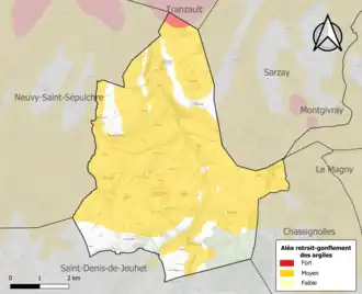 Le retrait-gonflement des sols argileux est susceptible d'engendrer des dommages importants aux bâtiments en cas d’alternance de périodes de sécheresse et de pluie. 79,6 % de la superficie communale est en aléa moyen ou fort (84,7 % au niveau départemental et 48,5 % au niveau national). Sur les 205 bâtiments dénombrés sur la commune en 2019, 184 sont en aléa moyen ou fort, soit 90 %, à comparer aux 86 % au niveau départemental et 54 % au niveau national. Une cartographie de l'exposition du territoire national au retrait gonflement des sols argileux est disponible sur le site du BRGM[20],[21].