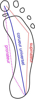 - Chez les coureurs universels (environ 40-45 %), cet appui se déplace sensiblement en ligne droite depuis l'extérieur du talon jusqu'au gros orteil ;