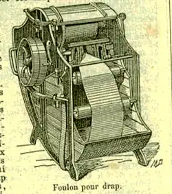 Dans les moulins à foulons les matériaux étaient battus par des maillets entraînés par la force motrice de l’eau. Des pilons verticaux avec des « masses » étaient mus soit manuellement, soit mécaniquement. Actuellement, on utilise des machines où le tissu passe entre des cylindres horizontaux animés d’un mouvement de rotation qui entraînent le drap plié en boudin en le comprimant.