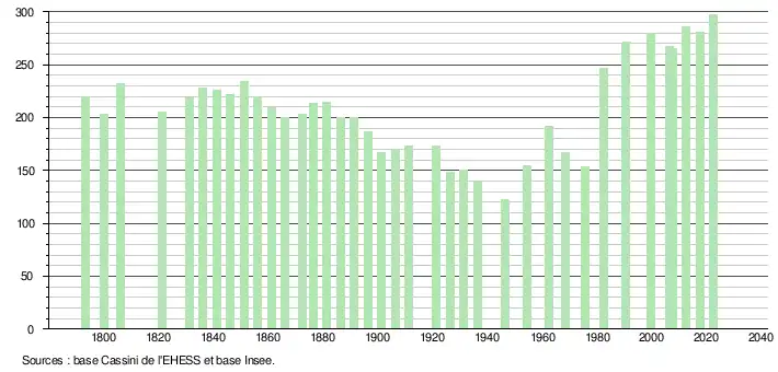 L'évolution du nombre d'habitants est connue à travers les recensements de la population effectués dans la commune depuis 1793. Pour les communes de moins de 10 000 habitants, une enquête de recensement portant sur toute la population est réalisée tous les cinq ans, les populations de référence des années intermédiaires étant quant à elles estimées par interpolation ou extrapolation[24]. Pour la commune, le premier recensement exhaustif entrant dans le cadre du nouveau dispositif a été réalisé en 2007[25].