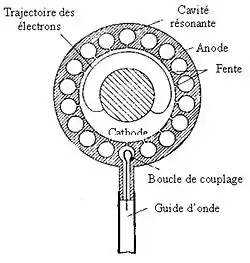 Le magnétron est constitué d'une anode cylindrique, composée de cavités, celles-ci se trouvent dans l'axe d'une cathode chauffante. Plus il y a de cavités, plus le rendement est élevé.
