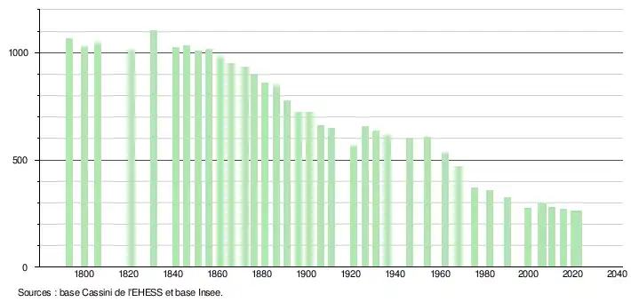 | L'évolution du nombre d'habitants est connue à travers les recensements de la population effectués dans la commune depuis 1793. Pour les communes de moins de 10 000 habitants, une enquête de recensement portant sur toute la population est réalisée tous les cinq ans, les populations de référence des années intermédiaires étant quant à elles estimées par interpolation ou extrapolation[20]. Pour la commune, le premier recensement exhaustif entrant dans le cadre du nouveau dispositif a été réalisé en 2005[21]. En 2022, la commune comptait 261 habitants[Note 3], en évolution de −1,14 % par rapport à 2016 (Gers : +1,04 %, France hors Mayotte : +2,11 %). |