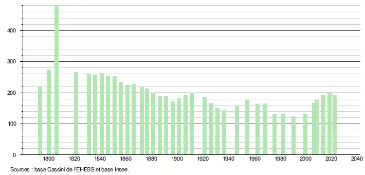 L'évolution du nombre d'habitants est connue à travers les recensements de la population effectués dans la commune depuis 1793. Pour les communes de moins de 10 000 habitants, une enquête de recensement portant sur toute la population est réalisée tous les cinq ans, les populations de référence des années intermédiaires étant quant à elles estimées par interpolation ou extrapolation[37]. Pour la commune, le premier recensement exhaustif entrant dans le cadre du nouveau dispositif a été réalisé en 2008[38].