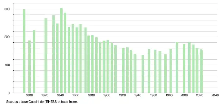 L'évolution du nombre d'habitants est connue à travers les recensements de la population effectués dans la commune depuis 1793. Pour les communes de moins de 10 000 habitants, une enquête de recensement portant sur toute la population est réalisée tous les cinq ans, les populations de référence des années intermédiaires étant quant à elles estimées par interpolation ou extrapolation[30]. Pour la commune, le premier recensement exhaustif entrant dans le cadre du nouveau dispositif a été réalisé en 2006[31].