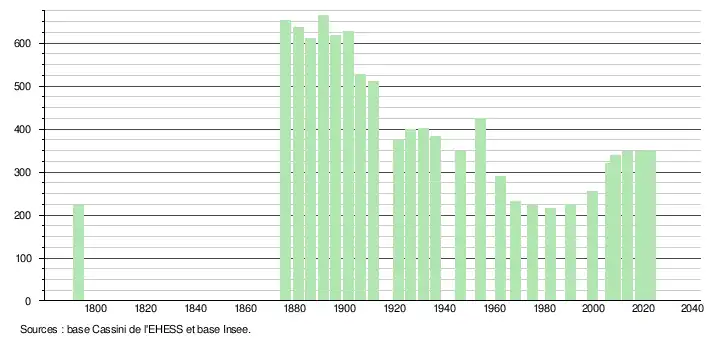 L'évolution du nombre d'habitants est connue à travers les recensements de la population effectués dans la commune depuis 1793. Pour les communes de moins de 10 000 habitants, une enquête de recensement portant sur toute la population est réalisée tous les cinq ans, les populations de référence des années intermédiaires étant quant à elles estimées par interpolation ou extrapolation[17]. Pour la commune, le premier recensement exhaustif entrant dans le cadre du nouveau dispositif a été réalisé en 2008[18].