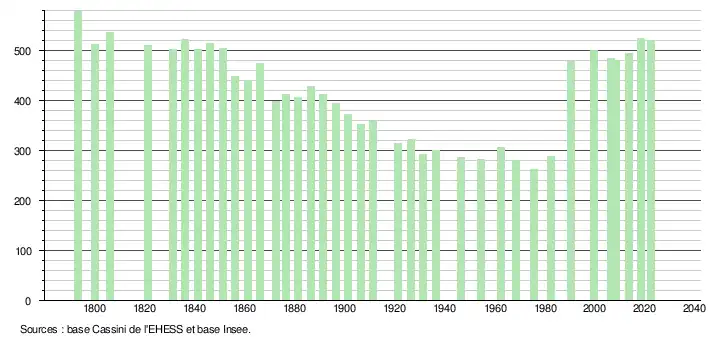 L'évolution du nombre d'habitants est connue à travers les recensements de la population effectués dans la commune depuis 1793. Pour les communes de moins de 10 000 habitants, une enquête de recensement portant sur toute la population est réalisée tous les cinq ans, les populations de référence des années intermédiaires étant quant à elles estimées par interpolation ou extrapolation[34]. Pour la commune, le premier recensement exhaustif entrant dans le cadre du nouveau dispositif a été réalisé en 2008[35].