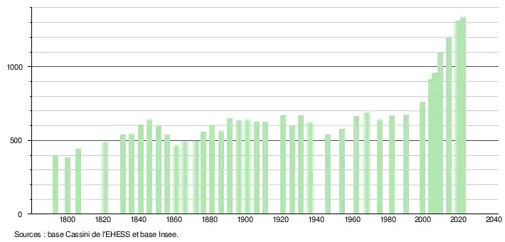 L'évolution du nombre d'habitants est connue à travers les recensements de la population effectués dans la commune depuis 1793. Pour les communes de moins de 10 000 habitants, une enquête de recensement portant sur toute la population est réalisée tous les cinq ans, les populations de référence des années intermédiaires étant quant à elles estimées par interpolation ou extrapolation[36]. Pour la commune, le premier recensement exhaustif entrant dans le cadre du nouveau dispositif a été réalisé en 2004[37].