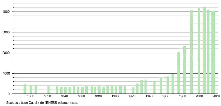 L'évolution du nombre d'habitants est connue à travers les recensements de la population effectués dans la commune depuis 1793. Pour les communes de moins de 10 000 habitants, une enquête de recensement portant sur toute la population est réalisée tous les cinq ans, les populations de référence des années intermédiaires étant quant à elles estimées par interpolation ou extrapolation[20]. Pour la commune, le premier recensement exhaustif entrant dans le cadre du nouveau dispositif a été réalisé en 2005[21].