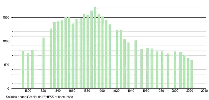 L'évolution du nombre d'habitants est connue à travers les recensements de la population effectués dans la commune depuis 1793. Pour les communes de moins de 10 000 habitants, une enquête de recensement portant sur toute la population est réalisée tous les cinq ans, les populations de référence des années intermédiaires étant quant à elles estimées par interpolation ou extrapolation[12]. Pour la commune, le premier recensement exhaustif entrant dans le cadre du nouveau dispositif a été réalisé en 2007[13].