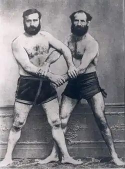 - ↑ Les saltimbanques et les baraques foraines — La lutte à « mains plates » sur le site de la Fédération française de lutte