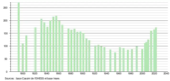 | L'évolution du nombre d'habitants est connue à travers les recensements de la population effectués dans la commune depuis 1793. Pour les communes de moins de 10 000 habitants, une enquête de recensement portant sur toute la population est réalisée tous les cinq ans, les populations de référence des années intermédiaires étant quant à elles estimées par interpolation ou extrapolation[28]. Pour la commune, le premier recensement exhaustif entrant dans le cadre du nouveau dispositif a été réalisé en 2004[29]. En 2022, la commune comptait 173 habitants[Note 5], en évolution de +6,13 % par rapport à 2016 (Hautes-Pyrénées : +1,59 %, France hors Mayotte : +2,11 %). |