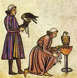 Frédéric II et son faucon représentés dans son livre De arte venandi cum avibus (De l'art de chasser au moyen des oiseaux).