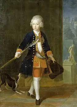 Portrait de deux enfants vêtus luxueusement comme des adultes ; un petit chien court devant eux.