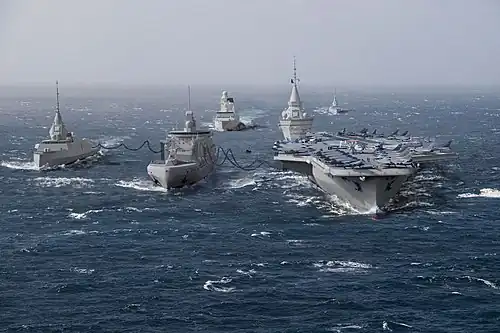 Flotte française prévue pour la fin des années 2030 : un Bâtiment ravitailleur de forces en Ravitaillement à la Mer (RAM) simultané avec le Porte-avions de nouvelle génération et une Frégate de défense et d'intervention.
