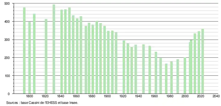 L'évolution du nombre d'habitants est connue à travers les recensements de la population effectués dans la commune depuis 1793. Pour les communes de moins de 10 000 habitants, une enquête de recensement portant sur toute la population est réalisée tous les cinq ans, les populations de référence des années intermédiaires étant quant à elles estimées par interpolation ou extrapolation[24]. Pour la commune, le premier recensement exhaustif entrant dans le cadre du nouveau dispositif a été réalisé en 2007[25].