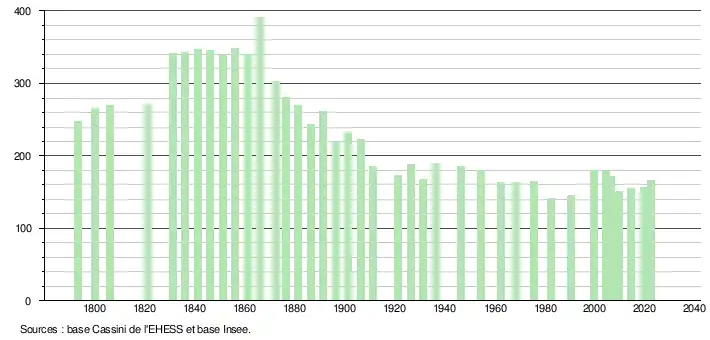 L'évolution du nombre d'habitants est connue à travers les recensements de la population effectués dans la commune depuis 1793. Pour les communes de moins de 10 000 habitants, une enquête de recensement portant sur toute la population est réalisée tous les cinq ans, les populations de référence des années intermédiaires étant quant à elles estimées par interpolation ou extrapolation[31]. Pour la commune, le premier recensement exhaustif entrant dans le cadre du nouveau dispositif a été réalisé en 2004[32].