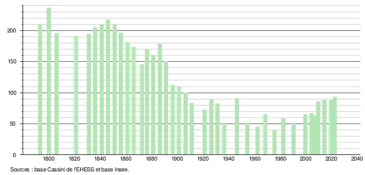L'évolution du nombre d'habitants est connue à travers les recensements de la population effectués dans la commune depuis 1793. Pour les communes de moins de 10 000 habitants, une enquête de recensement portant sur toute la population est réalisée tous les cinq ans, les populations de référence des années intermédiaires étant quant à elles estimées par interpolation ou extrapolation[12]. Pour la commune, le premier recensement exhaustif entrant dans le cadre du nouveau dispositif a été réalisé en 2004[13].