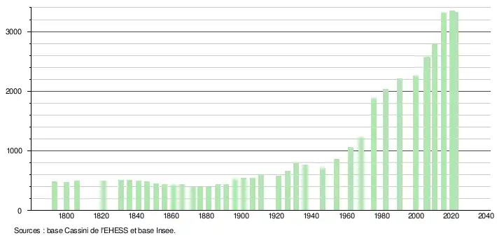 L'évolution du nombre d'habitants est connue à travers les recensements de la population effectués dans la commune depuis 1793. Pour les communes de moins de 10 000 habitants, une enquête de recensement portant sur toute la population est réalisée tous les cinq ans, les populations de référence des années intermédiaires étant quant à elles estimées par interpolation ou extrapolation[29]. Pour la commune, le premier recensement exhaustif entrant dans le cadre du nouveau dispositif a été réalisé en 2005[30].