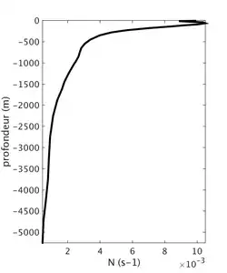 - une oscillation se produit si et seulement si , c'est-à-dire si le nombre sous la racine carrée est positif et la racine carrée est donc réelle. Cela impose que soit négatif, ce qui se traduit par le fait que le gradient de densité est négatif (la stratification du milieu doit être telle que la densité diminue avec l'altitude) ; dans le cas contraire, le nombre sous la racine est négatif et sa racine carrée est un nombre imaginaire pur. L'interprétation physique en est que l'oscillation se dissipe, comme c'est le cas dans un fluide dont la stratification n'est pas stable et où se produit de la convection : la parcelle déplacée devient par exemple moins dense que son environnement et accélère dans la même direction que le déplacement initial (pas d'oscillation) ;