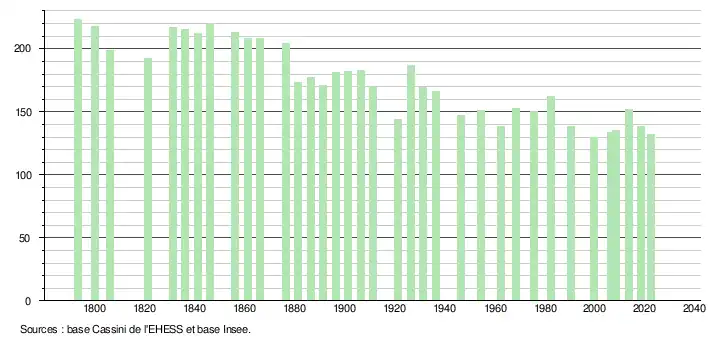 L'évolution du nombre d'habitants est connue à travers les recensements de la population effectués dans la commune depuis 1793. Pour les communes de moins de 10 000 habitants, une enquête de recensement portant sur toute la population est réalisée tous les cinq ans, les populations de référence des années intermédiaires étant quant à elles estimées par interpolation ou extrapolation[49]. Pour la commune, le premier recensement exhaustif entrant dans le cadre du nouveau dispositif a été réalisé en 2008[50].