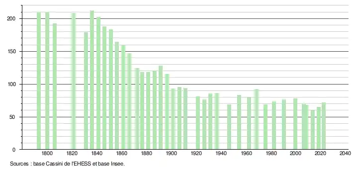 - ↑ Population municipale de référence en vigueur au 1er janvier 2025, millésimée 2022, définie dans les limites territoriales en vigueur au 1er janvier 2024, date de référence statistique : 1er janvier 2022.
