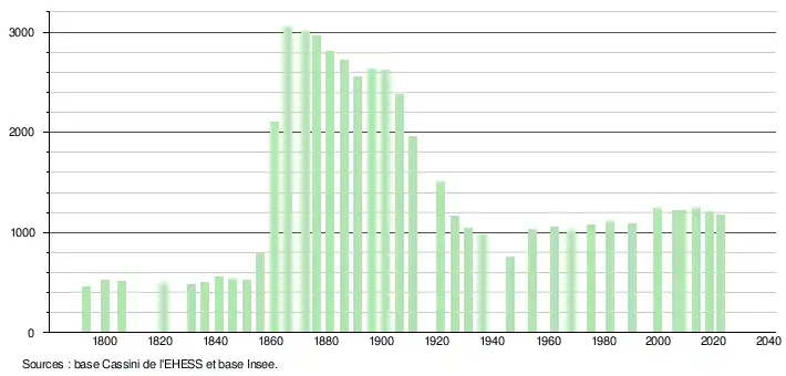L'évolution du nombre d'habitants est connue à travers les recensements de la population effectués dans la commune depuis 1793. Pour les communes de moins de 10 000 habitants, une enquête de recensement portant sur toute la population est réalisée tous les cinq ans, les populations de référence des années intermédiaires étant quant à elles estimées par interpolation ou extrapolation[17]. Pour la commune, le premier recensement exhaustif entrant dans le cadre du nouveau dispositif a été réalisé en 2008[18].