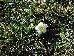 Les fleurs sont blanches, jaunâtres de 15 à 20 mm de diamètre. La plante fleurit de mai à juin.