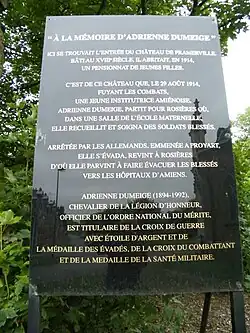 - ↑ Vincent Fouquet, « Le portrait d'une héroïne de guerre à Framerville-Rainecourt : Avant d'être la dernière « Poilue » vivante, Adrienne Dumeige, institutrice, était une héroïne de 14-18. Son portrait a été offert ce dimanche 14 juillet par la peintre Arlette Lendroit à la commune où elle a réalisé ses faits d'armes, en présence de ses deux enfants, 97 et 90 ans », Le Courrier picard, (lire en ligne, consulté le ) « Adrienne Dumeige, qui se repose dans le château de Framerville, décide d'aller aider les soldats blessés du 5e régiment de Dragons. Elle les soigne, en sauve énormément, mais les Allemands reprennent leur progression et elle doit se cacher avec ses blessés dans une école à Rosières. Découverte par l'ennemi, elle est arrêtée. Comme elle n'est pas militaire, elle est considérée comme espionne et lors de son transfert vers les officiers allemands à Proyart, elle s'évade… Pour mieux revenir à Rosières ou elle reprend les soins aux soldats, tout en s'engageant au sein du régiment ».