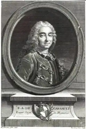 Petit-fils d'Alain de Garsault[2], François-Alexandre de Garsault est né le 25 mars 1693 à Paris et a été baptisé le lendemain à Saint-Eustache[3]. Il est le fils de Antoine Alexandre de Garsault, écuyer ordinaire du Roy, capitaine général des haras de France, et de Marie Anne Faille. Il reçoit une éducation complète lui permettant d'écrire sur une grande variété de sujets. Il devient capitaine des haras au Haras du Pin et publie plusieurs ouvrages sur le milieu équestre. Le Nouveau parfait Maréchal, ouvrage de vulgarisation sur le cheval publié en 1741, pour lesquelles il réalise également les illustrations, rencontrera un fort succès durant le XVIIIe siècle. Il y traite méthodiquement de tout ce qui touche au cheval et à l'écuyer[4]. Doté d'une bonne culture scientifique, il publie également des écrits de botanique (il s'intéresse par exemple aux Ptéridophytes et Spermatophytes[5]) et zoologie, notamment Figures des plantes et animaux d'usage en médecine en 1764. Il participe à plusieurs ouvrages pour l'Académie des Sciences sur les métiers de bourrelier[6], cordonnier[7], lingère[8], paumier-raquettier[9], perruquier[10], sellier[6] et tailleur[11].