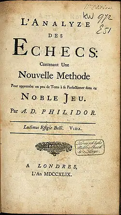- ↑ Philidor, L'Analyse des échecs : contenant une nouvelle méthode pour apprendre en peu de temps à se perfectionner dans ce noble jeu, Londres, 1749, préface p. XVIII.