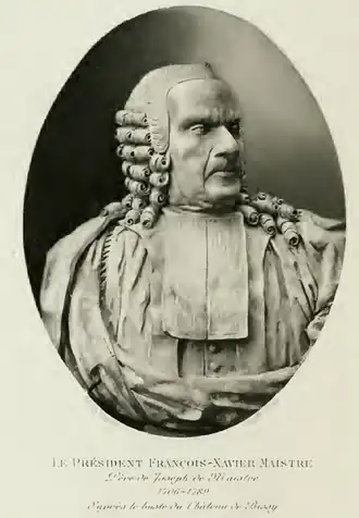 - ↑ Voir la thèse de 1977 d'Henri Arminjon publiée à Annecy, chez Gardet, intitulée : « De la noblesse des sénateurs au Souverain Sénat de Savoie et des Maitres Auditeurs à la cour des Comptes ». Cette thèse est agréée par la commission des preuves de l'ANF depuis l'année 1983. Le tableau XI 5, intitulé Promotions Sénatoriales 1700-1792 mentionne : François-Xavier Maistre, niçard, entré au Sénat le 17 mars 1740. Statut ou profession du père : négociant. Statut personnel : roturier[4].