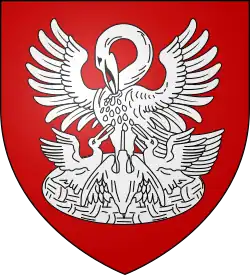 Le blason de la famille Pélisson[16] de Jarjayes porte « de gueules au pélican d'argent dans sa piété du même ».