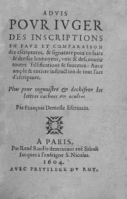 - Advis pour juger des inscriptions en faux et comparaison des escritures et signatures, pour en faire et dresser les moyens, veoir et descouvrir toutes falsifications et faulsetez, plus pour cognoistre et deschifrer les lettres cachées et occultes..., Paris, René Ruelle, 1604, 8°, XVI-96 p. (Paris BNF : F-27625, VZ-2212). Numérisé sur Gallica.