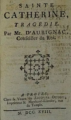 - La Pratique du Théâtre, 1657 ou 1669, in-4°. Les exemplaires sous ces deux dates sont de la même édition ; réimprimés en 1715 à Amsterdam, 2 vol. in-8°. Cette édition contient le Discours de Gilles Ménage sur l'Heautontimorumenos, et le Térence justifié. D'Aubignac travailla jusqu'à la fin de sa vie à retoucher la Pratique du Théâtre et y ajouta un chapitre entier sur les discours de piété dans les tragédies. On le trouve dans la Continuation des Mémoires de littérature et d'histoire donnée par le P. Desmolets, t. 6, p. 210. L'auteur avait retranché de son livre tous les endroits où il parle de Corneille. « La Pratique du Théâtre, dit La Harpe, est un lourd et ennuyeux commentaire d'Aristote, fait par un pédant sans esprit et sans jugement, qui entend mal ce qu'il a lu, et qui croit connaître le théâtre, parce qu'il sait le grec. »