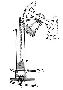L’explosion repoussait le piston vers le haut[8], lequel, retombant sous son propre poids, accrochait au passage une gâchette qui faisait engrener la crémaillère du piston avec un arbre autour duquel une corde était enroulée. L'extrémité de cette corde était enroulée à l'arbre des roues avant. Le poids du piston était calculé pour faire tourner les roues de la charrette. Une fois le piston descendu en bout de course, la gâchette permettait de débrayer l'arbre supérieur du piston et d'engager le cycle suivant[1],[7],[8].
