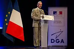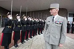 Le , François Lecointre annonce son départ du poste de chef d'état-major des armées[49]. Il fait son adieu aux armes dans la cour d'honneur des Invalides à Paris le , lors d'une cérémonie présidée par le président de la République Emmanuel Macron[50]. Le lendemain, le général d'armée Thierry Burkhard, chef d'état-major de l'Armée de terre, lui succède[51].