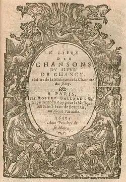 - Ve livre des Chansons du sieur de Chancy, maistre de la musique de la Chambre du roi. Paris : Robert III Ballard, 1655. 1 vol. 8°. RISM C 1850, Guillo 2003 n° 1655-J.