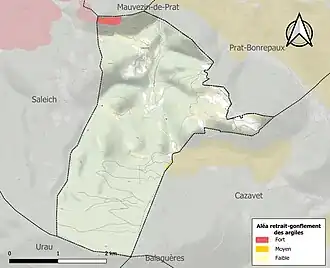 Le retrait-gonflement des sols argileux est susceptible d'engendrer des dommages importants aux bâtiments en cas d’alternance de périodes de sécheresse et de pluie. 0,7 % de la superficie communale est en aléa moyen ou fort (88,8 % au niveau départemental et 48,5 % au niveau national). Sur les 17 bâtiments dénombrés sur la commune en 2019, 0 sont en aléa moyen ou fort, soit 0 %, à comparer aux 98 % au niveau départemental et 54 % au niveau national. Une cartographie de l'exposition du territoire national au retrait gonflement des sols argileux est disponible sur le site du BRGM[24],[Carte 3].